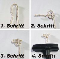 Führen Sie das Seil durch den Startergriff. Verknoten Sie es am anderen Ende mit einem lösbaren Seilknoten (s. Abbildung). Dieser Knoten ermöglicht Ihnen das zerstörungsfreie Lösen des Seiles bei einer erneuten Wartung.