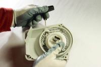 Im Laufe der Jahre lässt die Federspannung der Startvorrichtung nach. Oftmals ist mangelnde Schmierung der Rückholfeder (s. Bauteile) die Ursache dafür. In der Folge läuft die Feder trocken bzw. kann leicht Rost ansetzten, und der verhindert anschließend die reibungslose Funktionsweise. Sollte also bei Ihnen der Startergriff herunterhängen, gehen Sie zur fachgerechten Wartung bitte wie folgt vor: