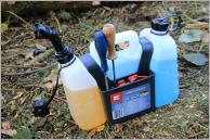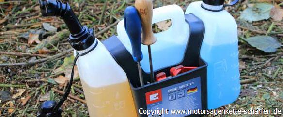 Etwas erstaunt waren wir bei unserer Recherche, das dass Unternehmen aus Landau an der Isar ebenfalls einen Kombikanister mit Stauraum anbietet. Schon beim Auspacken wird einem schnell klar, dass der wirklich preiswerte Kombikanister wohl eher den Hobby-Motorsägenführer als Kunde anspricht. Zum Preis von knapp 20,- Euro erhält der Käufer einen kompakten Doppelbehälter mit einem Fassungsvermögen von 3 Litern Kraftstoff und 1,25 Litern Kettenöl. Für den Profi-Alltag ist dies eindeutig zu wenig.
