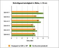 Im Test zeigt sich dann auch der Vorteil der hohen Kettengeschwindigkeit. Im Durchschnitt benötigt die Husky 4,7 Sekunden für einen Schnitt, das Konkurrenzprodukt hingegen durchschnittlich 5,2 Sekunden. Damit bestätigt sich unserer Meinung nach die Werbebotschaft von Husqvarna.