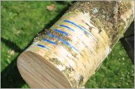 An einem zylindrisch-rundem Birkenstamm mit 15 cm Durchmesser soll die Husky drei Scheiben mit ca. 3 cm Holzstärke abschneiden. Wir stoppen für jeden Schnitt die Zeit. Anschließend wiederholen wir den Test mit einer Akkusäge eines anderen Herstellers. Um Unregelmäßigkeiten im Holz auszugleichen, wiederholen wir den Schnitttest nochmals, so das jede Säge insgesamt 6 Holzscheiben abtrennen muss.