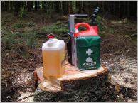 Nachteilig ist die Befestigung der Erste-Hilfe-Tasche. Diese ist an einem gekanteten, dünnen Alublech befestigt. Beim Transport im Wald wurde dieses Blech mehrfach durch das Hängen bleiben an Ästen verbogen. Zwar lässt sich das Problem durch Kaltverformung wieder revidieren, lästig bleibt die Lösung aber dennoch. Wie lange die Tasche für das Verbandset den Verschmutzungen durch Kraftstoff und Kettenöl standhält, wird sich bei einem längeren Test zeigen. Der Ölausgießer stammt offensichtlich aus dem Campingzubehör. Er macht einen einfachen Eindruck und lässt sich zudem nicht durch das Ausgießersystem der Fa. Aspen ersetzen. Zeitgemäß wäre hier ein Gewinde, welches ein professionelleres Befüllsystem aus dem Zubehör (evt. mit Stoppfunktion) aufnehmen könnte.