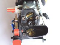 Vergaser und Motoren wurden grundlegend überarbeitet. So wurden die Vergaser mit zwei Drosselklappen (s. Abb. 2)versehen, die beide synchron auf die Gasgriffstellung reagieren. Durch den ersten Luftkanal gelangt ein herkömmliches Gas-Luftgemisch in das Kurbelgehäuse. Durch den zweiten Luftkanal (s. Abb. 3) gelangt anschließend reine Luft zur Vorverdichtung und legt sich quasi in einer eigenen Schicht über das Kraftstoff/Luftgemisch.