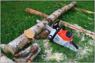 Zu Beginn der Sägearbeiten sind wir erneut angenehm überrascht. Die Säge zieht auch im Birkenholz gut durch. Selbst das Schneiden mit auslaufender Kette und auch Stechschnitte sind problemlos möglich. Als sehr angenehm empfinden wir, dass zwischen den Trennschnitten immer wieder Ruhe herrscht. Lässt man den Gasgriff los, stoppt die Kette unmittelbar. Wenn ein Manipulieren der Stämme nötig wird oder wenn kurze Brennholzscheite beiseite geräumt werden müssen, entstehen somit auch keine Leerlaufzeiten. Und anders als bei herkömmlichen Elektrokettensägen stört auch kein Kabel. Echt Klasse die Säge!