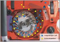Einige Hersteller lösen das Schmutzproblem in der Ansaugluft durch eine technisch innovative Lösung. Als erstes baute Husqvarna in seine Sägen (s. Abb. 2) das so genannte „Air Injection-System“ ein. Bei diesem System, das im Übrigen mittlerweile auch andere Hersteller anwenden, wird die zur späteren Verbrennung benötigte Luft durch das Gehäuse der Anwerf- oder Startervorrichtung gesaugt und anschließend durch das Lüfterrad kreisförmig verwirbelt. Durch diese Kreisbeschleunigung werden die schweren Schmutzpartikel nach außen und weiter durch den Motorraum abtransportiert. Der Vergaser saugt nun über einen Luftkanal (s. Abb. 3) die vorgereinigte Luft an. Da das Gehäuse relativ dicht den Vergaserraum abschließt, gelangt somit nur noch solchermaßen gesäuberte Luft an den Luftfilter. Das Ergebnis sind deutlich längere Standzeiten bzw. eine geringere Verschmutzungsneigung der Luftfilter.