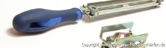 Vielen Motorsägenbesitzern dürfte der Feilenhalter für Rundfeilen der Fa. Stihl bereits ein Begriff sein. Dieses praktische Hilfsmittel wird auf eine für die jeweilige Zahnteilung passende Rundfeile montiert und hilft dabei, insbesondere den für die Schärfung relevanten Feilenüberstand über dem Zahndach einzuhalten.