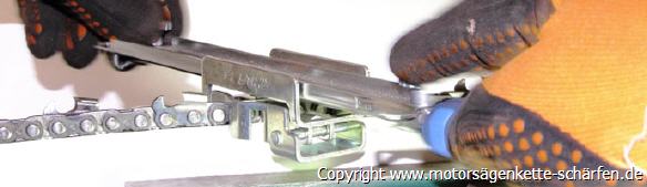 1. FF 1 auf die montierte Kette aufsetzen. 2. Zahn mittig positionieren: 3. Runfeile mit Rundfeilenhalter waagerecht auflegen. 4. Mehrmals den Feilenhalter durch das FF 1 führen. |