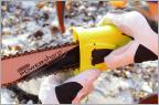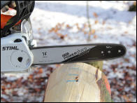 Nach dem Test mit dem besandeten Holz reinigen wir Säge, Schiene und Kette gründlich. Anschließend wird die Powersharp-Kette geschärft. Und wieder werden drei Holzscheiben abgeschnitten. Die gemittelte Zeit wird mit der Zeit aus dem ersten Test verglichen. |