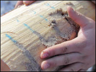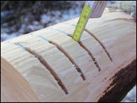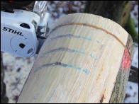 Wir sägen viere Stechschnitte mit gleicher Tiefe in den Buchenstamm und befüllen die Schnitte mit Quarzsand. Anschließend müssen die beiden Ketten jeweils zwei Scheiben genau durch die sandgefüllten Schnitte abtrennen. |