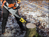 Mit beiden Sägeketten (HM/PS) schneiden wir drei Buchenscheiben ab und messen dabei die Zeit. Die drei Zeiten werden anschließend gemittelt. Der Stammdurchmesser beträgt 25 cm. |