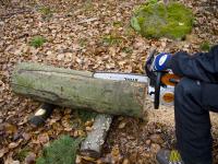 Doch damit nicht genug. Abschließend erfolgte ein tiefer Stechschnitt in das Erdreich. Die Führungsschiene wurde auf eine Länge von ca. 15cm mit laufender Kette in Erdreich gestoßen. Zu guter Letzt wurde dann nochmals versucht, mindestens eine Buchenscheibe abzuschneiden.