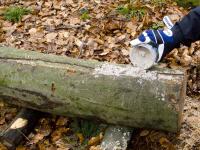 In die eine Hälfte des Buchenabschnittes wurde mit einer anderen Säge ein Längsschnitt (s. Abb. 1) eingebracht und dieser mit Quarzsand verfüllt. Quarzsand wirkt sich auf die Schärfe äußerst abrasiv aus und führt sehr schnell zum abstumpfen der Kette.