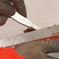 Während des Schneidevorgangs sammelt sich in der Schwertnut feiner, ölgetränkter Holzstaub (s. Abb. 5) an. Da dieser die Ölaufnahme beeinträchtigen kann, empfiehlt es sich, regelmäßig (täglich nach Gebrauch) die Schwertnut mit einem speziellen Werkzeug zu reinigen. Diese so genannten Schwertnutreiniger sind im Fachhandel erhältlich, lassen sich aber auch aus einem ca. 1,5 mm starkem Blech selber anfertigen.