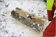Sollte nach 2-3 Schlägen das Meterstück nicht aufreißen, empfiehlt sich der Einsatz eine Alu-Spaltkeiles. Sägen Sie zur besseren Positionierung des Alukeils das Meterstück mit der Motorsäge über die Stirnflächenkante ein wenig ein. Der Spaltkeil wird nun mit leichtem Hammerschlag schräg zum Faserverlauf (s. Bildergalerie) angesetzt. Anschließend mit kräftigen Schlägen den Keil weitertreiben, bis das Holz aufreißt. Durch gezieltes Nachschlagen mit dem Spalthammer werden die Hälften dann endgültig getrennt.