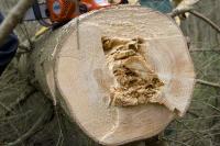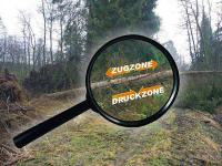 Begutachten Sie zunächst den geworfenen Stamm hinsichtlich seiner Spannungsverhältnisse. Stellen Sie fest, wo im Stamm die DRUCKZONE und wo die ZUGZONE liegt.