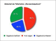 Wir ermitteln die Gesamtzeit für den jeweiligen Test sowie alle 15 Sekunden, welche Tätigkeit (gegliedert in die Teilarbeiten „Sägebock bestücken“, „Holz sägen“, „Sägebock entladen“) gerade verrichtet wird. Daraus ergibt sich eine Verteilung der Arbeitszeiten je Arbeitsablauf.