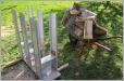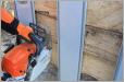 Los geht's mit der Sägearbeit! Die Säge zieht mit genügend Abstand zu den Stahblechrungen durch das Holz. Die Führungsschiene unserer Motorsäge ist mit 38 cm Schnittlänge optimal geeignet, selbst eine kürzere Schiene mit z.B. 32 cm Länge wäre ausreichend dimensioniert.
