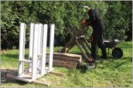 Beim Arbeiten mit dem Scheitholzbock sieht der Arbeitsablauf wie folgt aus: Der Bock wird mit 10 Meterscheiten bestückt - anschließend wird die Säge gestartet und das Holz eingeschnitten. Im dritten Arbeitsgang wird das gesamte Holz in eine Schubkarre verladen.