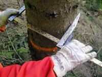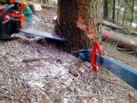 Nachdem der 2/3-Fällschnitt fertig gestellt ist, wird der Fällheber in den Schnitt eingeführt. Achten Sie auf festen bzw. tiefen Sitz der Fällheberplatte im Baum.