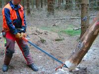 Zum Abschluss der Fällung „aus den Beinen“ heraus und mit geradem Rücken den Fällheber anheben und den Baum somit in die richtige Richtung zu Fall bringen. Fällt der Baum selbständig weiter, treten Sie auf der Rückweiche in den sicheren Arbeitsraum zurück und beobachten Sie aufmerksam das Ausschwingen der Nachbarbäume.