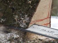 Anschließend wird das verbleibende 1/3 des Stammes etwas über oder unterhalb der Schnitthöhe des ersten Fällschnittes so durchtrennt, das die Schnitte sich um ca. 1-2 cm überlappen. ACHTUNG! Die Fällheberplatte darf nicht unterschnitten bzw. überschnitten werden. Lediglich die beiden Schnitte müssen sich überlappen. Auf diese Art und Weise wird der Fällschnitt fertiggestellt, ohne das die Sägenkette und der Fällheber sich im gleichen Schnitt befinden.