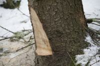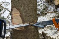 Die Schnittbreite der 0,325“-Ketten ist häufig schmäler als die Materialstärke der Fällheberplatte. Je nach Fällheber kann es daher notwendig sein, den soeben angelegten Fällschnitt etwas zu verbreitern. Am besten schneidet man jetzt in umgekehrter Richtung von der Bruchleiste zur hinteren Stammseite mit der Motorsäge zurück. Durch leichtes Verkanten der Säge wird der Schnitt somit leicht verbreitert. ACHTUNG! Den Schnitt nicht zu stark verbreitern, da ansonsten die Fällheberplatte zu viel Spiel im Fällschnitt hat. In der Folge könnte unter Umständen der Baum nach der Fertigstellung des Fällschnittes sich leicht zurückneigen. Sollte versehentlich der Fällschnitt mehr als die 1,5fache Schnittbreite aufweisen, setzten Sie den Kunststofftaschenkeil in den Fällschnitt und verhindern so ein zurückneigen des Baumes.