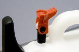 Der eingeklappte Druckknopf und Ausguss zeigen an, dass die Belüftung dicht verschlossen bzw. das Ventil verriegelt ist. Beide kann man „im Handumdrehen“ ausklappen und damit entriegeln. Der Kanister ist aber immer noch dicht verschlossen. Jetzt bringt man den Rapidon 6 in die Befüllposition. Der Tankstutzen kann bis zu ca. 45° angewinkelt werden, so dass man auch schwer zugängliche Tanköffnungen gut erreicht. Die seitliche Abflachung an diesem ermöglicht es der Luft, ungehindert aus dem Tank zu entweichen.