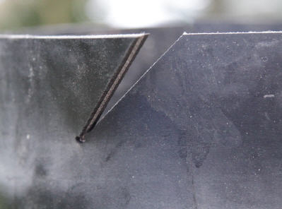 Durch die schräg verlaufenden Eischnitte wird der obere Rand "weich". Durch die Schnitte wird das Gummi und der Werkzeugstiel geschont. |